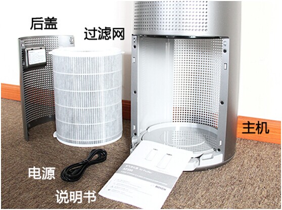 打開博世AP350空氣凈化器的外包裝,我們可以看到其組件分別有空氣凈化器主機、過濾網(wǎng)、后蓋、一目了然,組裝也很簡單。其他還有電源線以及產(chǎn)品說明書。