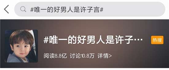 因為長的太可愛,性格又超暖,演技還持續(xù)在線,許子言出場沒幾次就俘獲了一波姐姐粉、媽媽粉,并一舉沖上熱搜第一名,獲得8.8億圍觀。